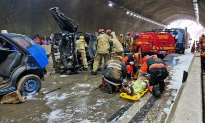 Exercício encenou colisão com vazamento de etanol e vítimas presas nas ferragens para testar a resposta de emergência em ambiente confinado.